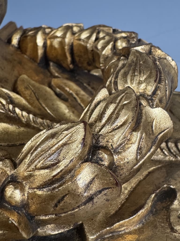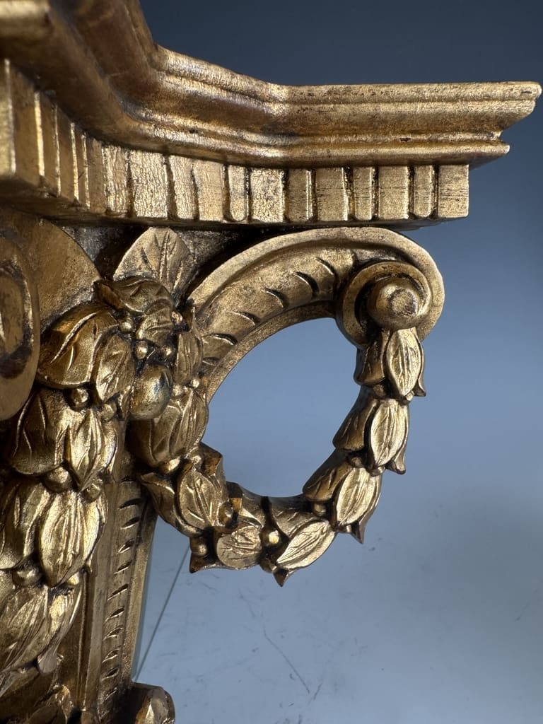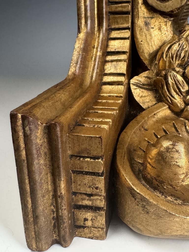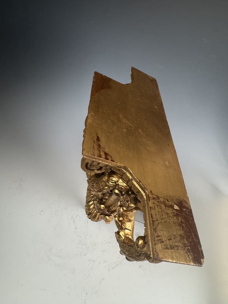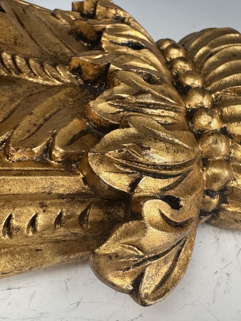 The gilding presents a warm, rich patina, with natural wear revealing undertones of red bole, which adds depth and authenticity to the finish — a desirable characteristic in period giltwood.