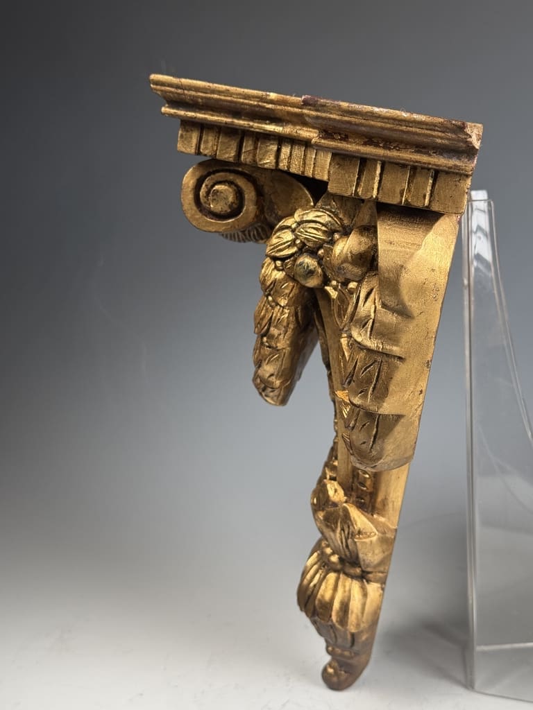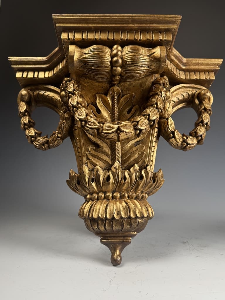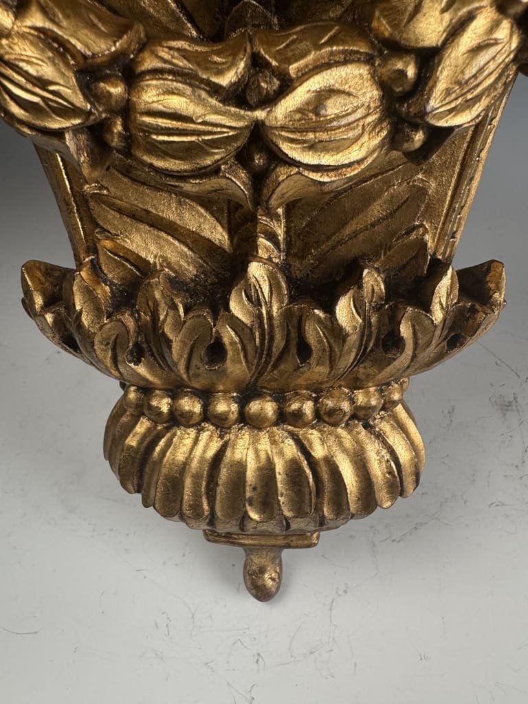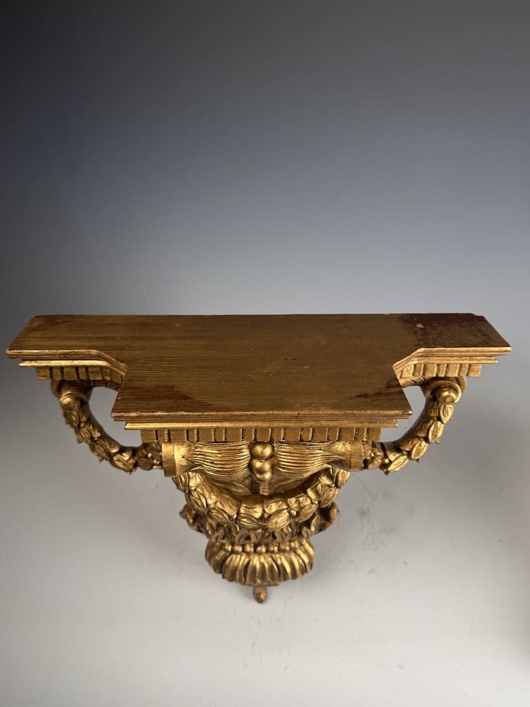 Crafted in richly gilded wood, these wall-mounted shelves feature elaborate, hand-carved details—notably acanthus leaves, scrollwork, and floral swags—hallmarks of the Rococo style. While the original Rococo movement emphasized playful asymmetry, natural motifs, and decorative flourish, these 19th-century interpretations reflect the Romantic-era revival of that style, blending historical elegance with the skilled craftsmanship of the period.