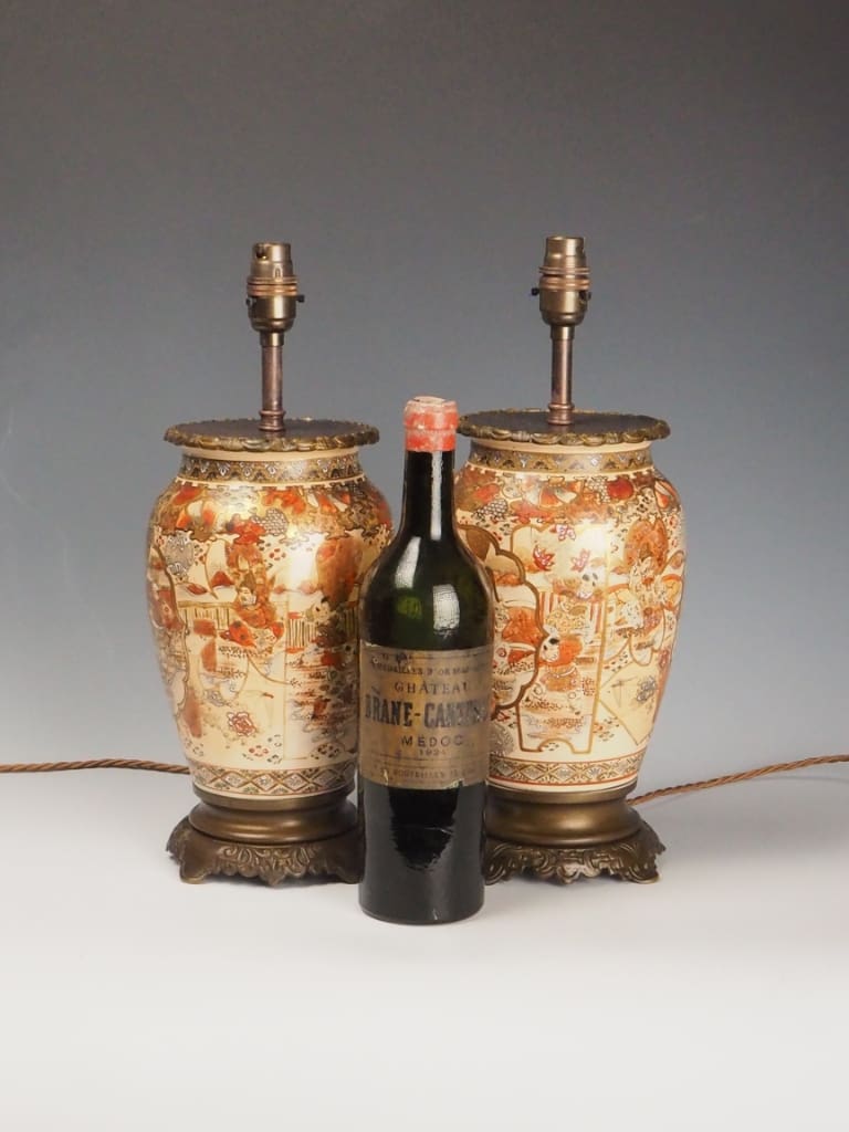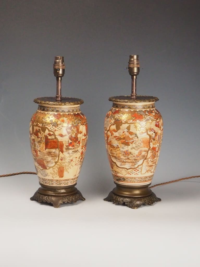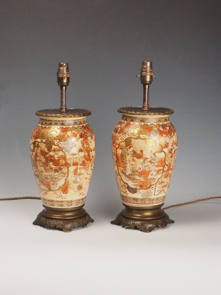 Each lamp is formed from a traditional Satsuma ware vase, beautifully adorned with intricate Japanese figural and landscape scenes, bordered by ornate gilded detailing. The delicate enamels and soft earthy tones are characteristic of authentic Satsuma ceramics—highly prized by collectors and interior designers alike.