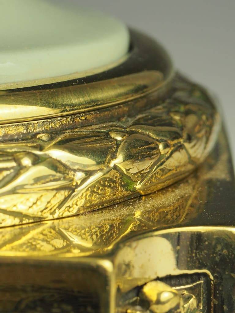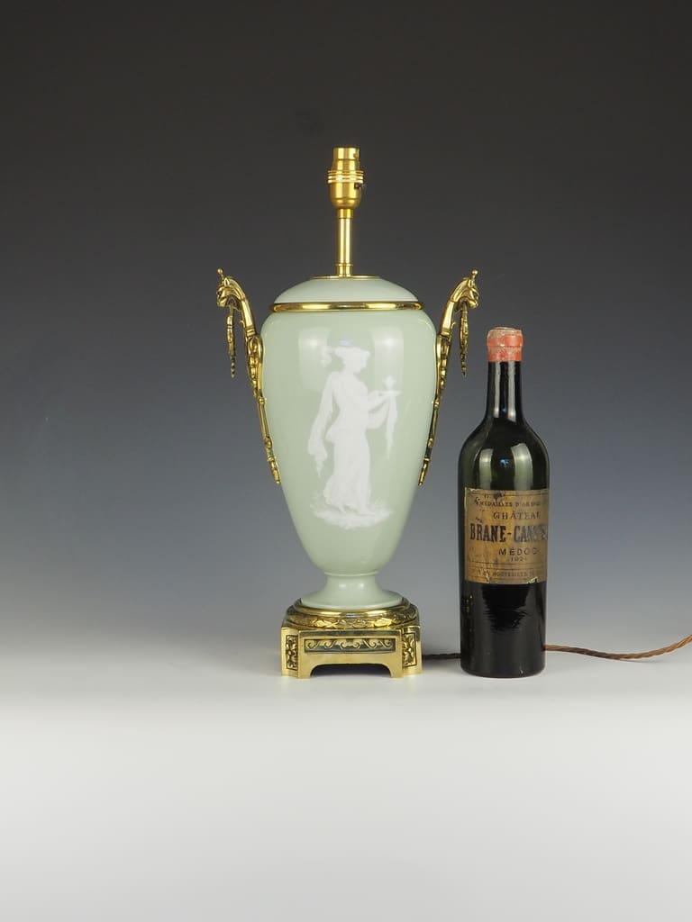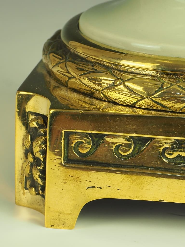 The pate-sur-pate detailing adds a touch of artistry to the lamp, making it a truly unique piece that will stand out in any room. The ormolu mounts with rings on each side further enhance the lamp's overall aesthetic appeal, adding a touch of luxury to its design.