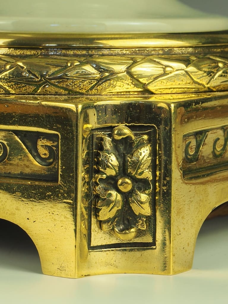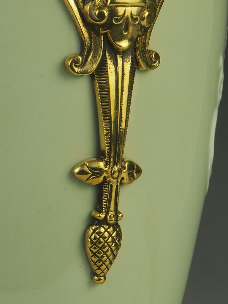 The celadon glazed porcelain is beautifully complemented by the intricate gilt-bronze embellishments, showcasing a perfect blend of colors and textures.