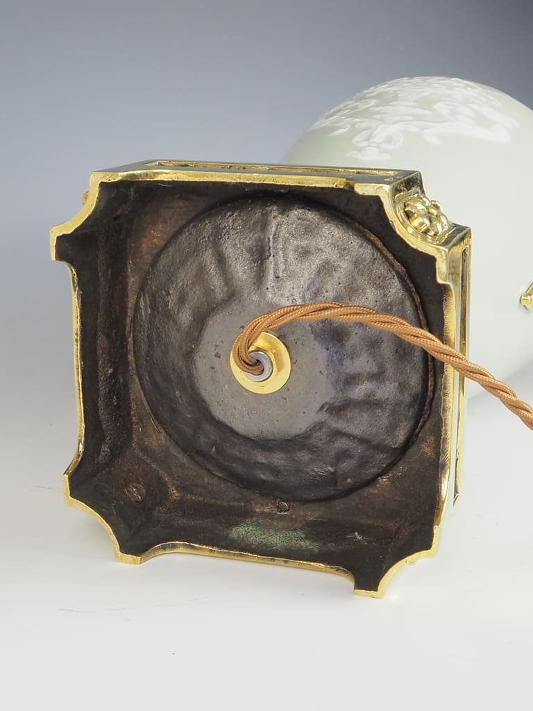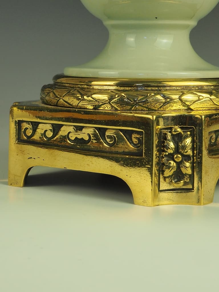 Antique Neoclassical Celadon Porcelain and Pate-Sur-Pate Table Lamp exudes elegance and sophistication with its exquisite design. The celadon glazed porcelain is beautifully complemented by the intricate gilt-bronze embellishments, showcasing a perfect blend of colors and textures.