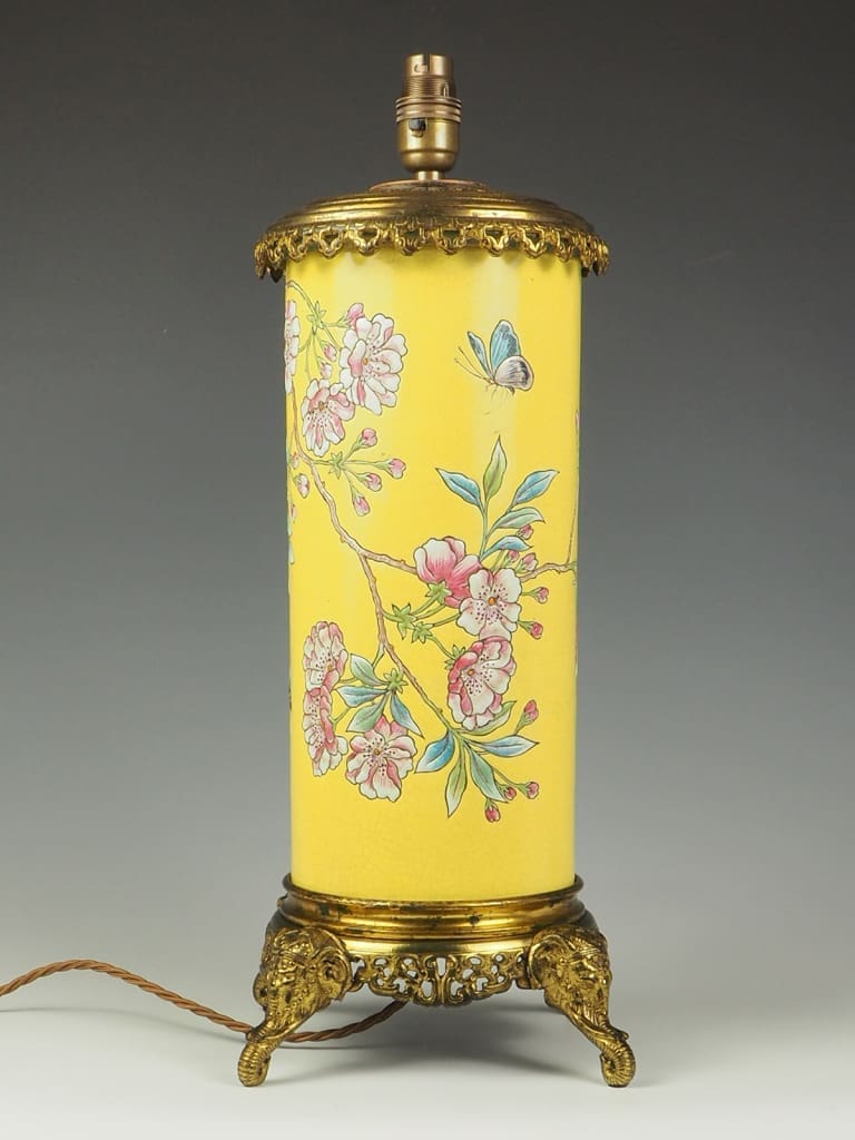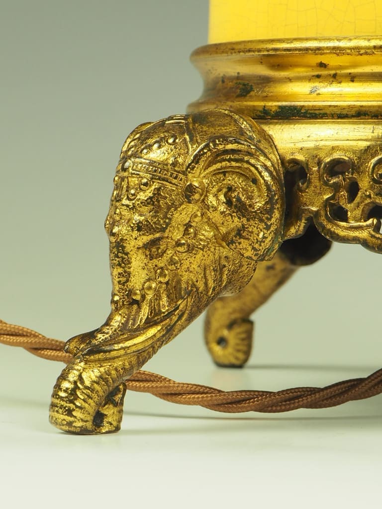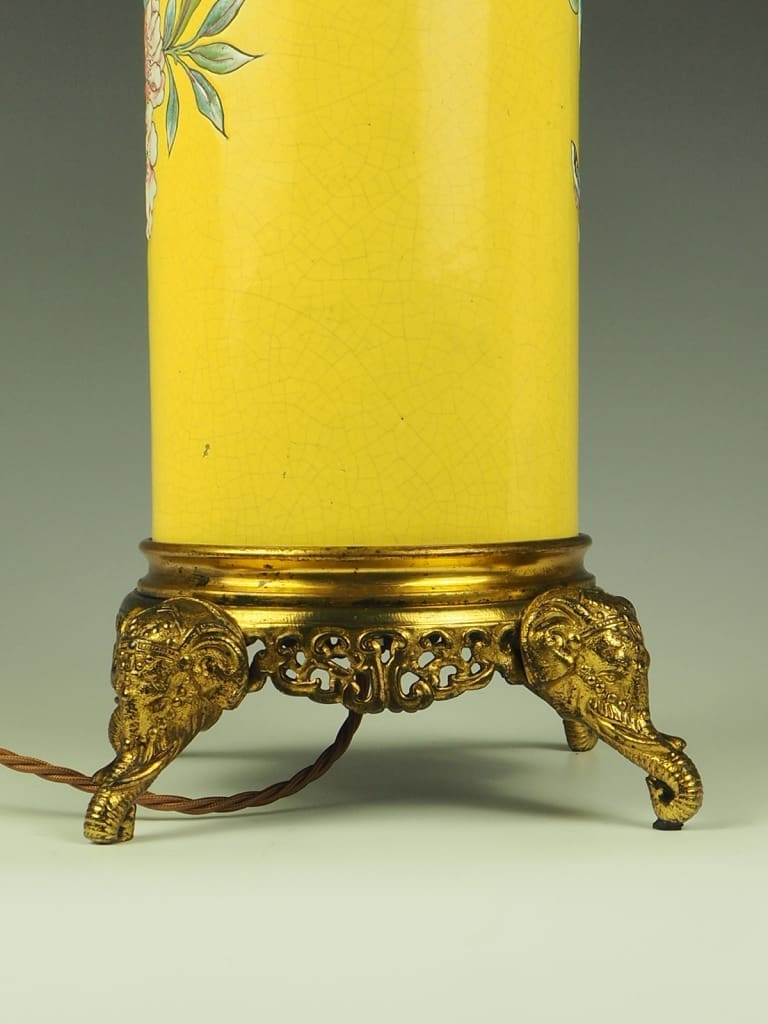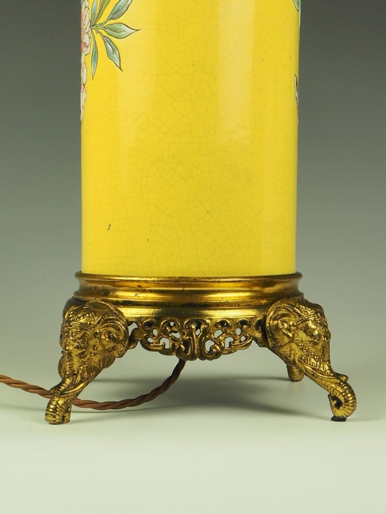 The lamp is supported by a gilt bronze base, which features four intricately crafted elephant trunks as feet. This exquisite detail not only adds stability to the lamp but also adds a touch of exoticism and grandeur. The combination of the porcelain body and the gilt bronze base creates a harmonious contrast, resulting in a visually striking piece that is sure to captivate the attention of anyone who lays eyes on it.