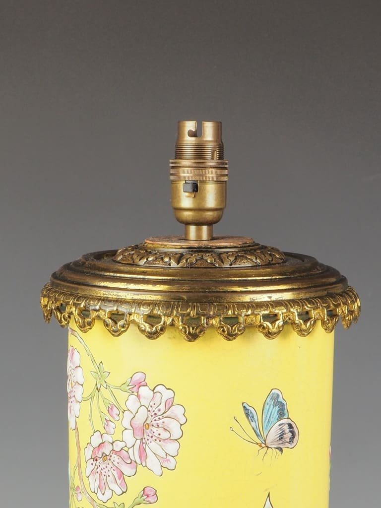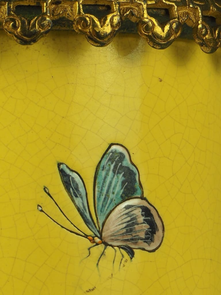 The unique yellow porcelain body of the lamp is adorned with intricate designs of butterflies and flowers, adding a touch of whimsy and natural beauty to its overall aesthetic. The vibrant yellow hue adds a cheerful and vibrant ambiance, making it a delightful focal point.