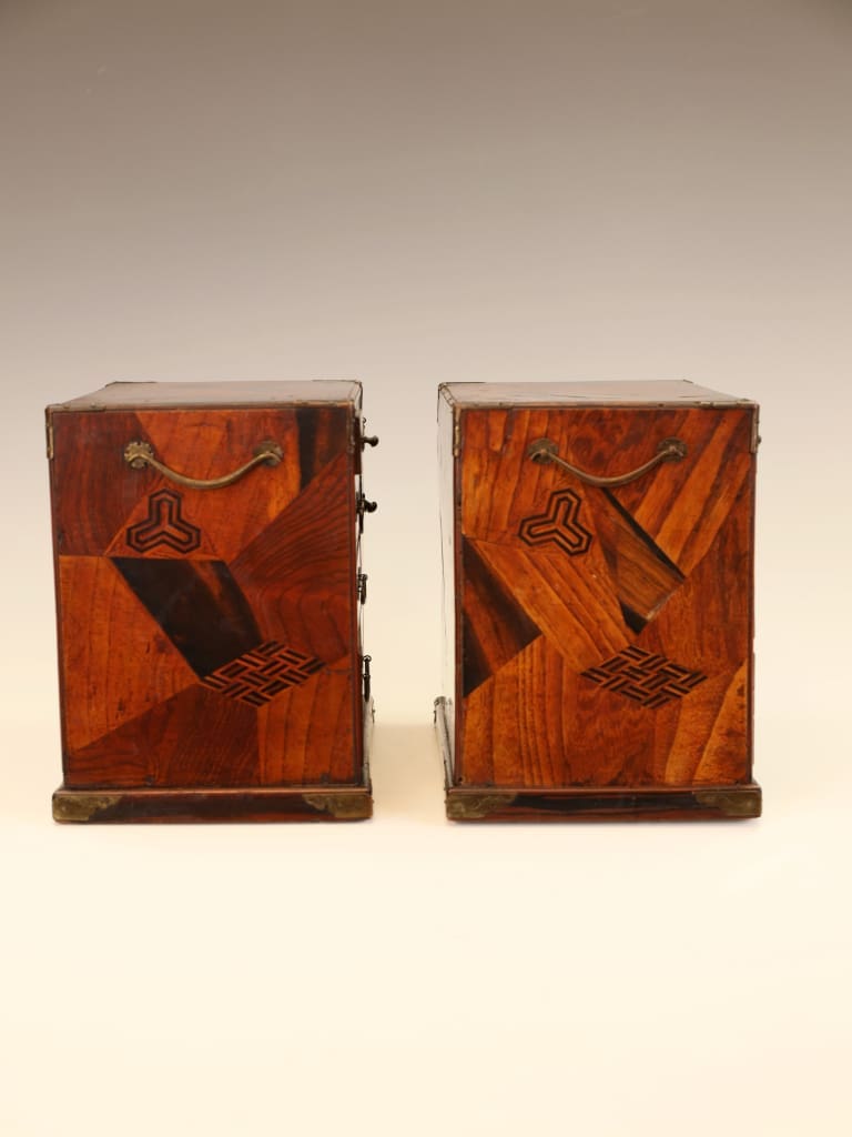 A truly remarkable and rare matching pair of late 19th-century Japanese Kodansu (table chests), masterfully decorated in the renowned Yosegi-zaiku marquetry of the Hakone region. Finding an identical pair of these cabinets in such cohesive condition is a significant discovery for the collector of Meiji-era decorative arts.