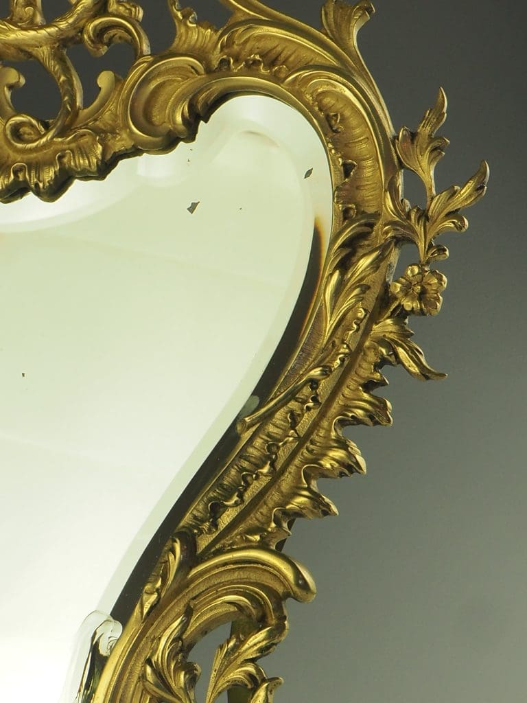 19th Century Rococo Revival Cartouche Shaped Mirror is a true testament to the exquisite craftsmanship of the era. The mirror boasts an original quality bevelled mirror plate, ensuring a clear and crisp reflection. The ornate wrythen frame is a work of art in itself, adorned with intricate c-scrolls, a majestic dragon, delicate flowers, and elegant leaves.