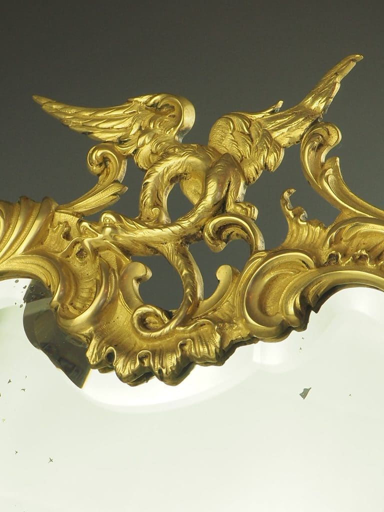 19th Century Rococo Revival Cartouche Shaped Mirror is a true testament to the exquisite craftsmanship of the era. The mirror boasts an original quality bevelled mirror plate, ensuring a clear and crisp reflection. The ornate wrythen frame is a work of art in itself, adorned with intricate c-scrolls, a majestic dragon, delicate flowers, and elegant leaves. Each detail has been meticulously crafted, showcasing the attention to detail and artistic flair of the period.