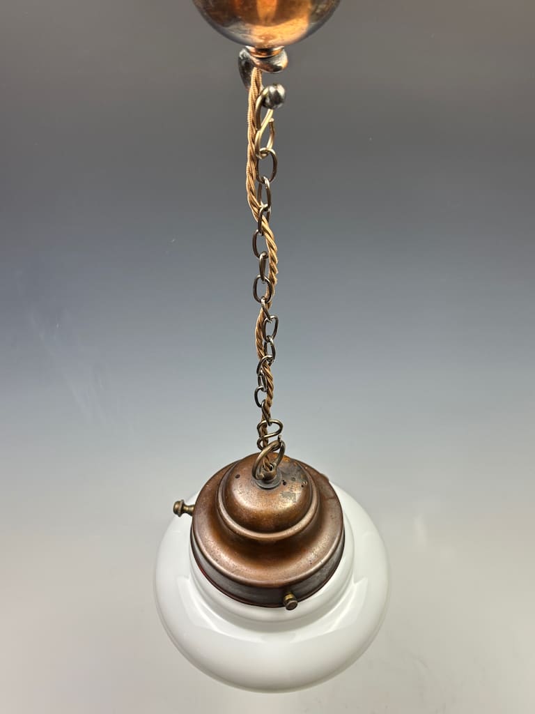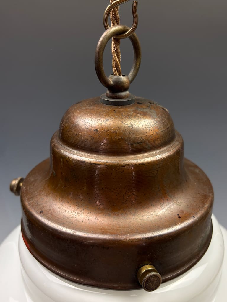 This original Art Deco pendant light is presented in excellent antique condition. The opaline glass shade is free from cracks or restoration, showing only minimal wear consistent with age. The bronze gallery retains its original patina, with light surface oxidation adding to its authentic period character.