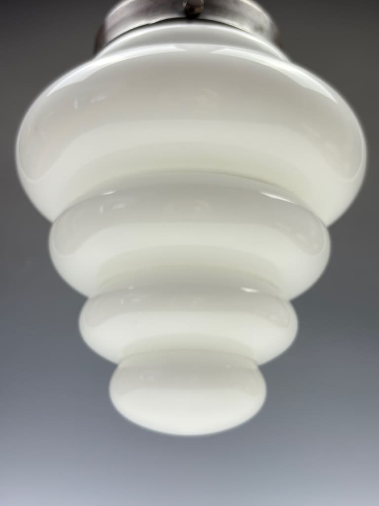 A striking and authentic example of early 20th-century design, this original Art Deco pendant light features a beautifully tiered opaline glass shade suspended from its original patinated bronze gallery. The stepped, beehive form of the shade is a classic hallmark of the Art Deco movement, reflecting the era’s fascination with geometric forms and modern industrial elegance.