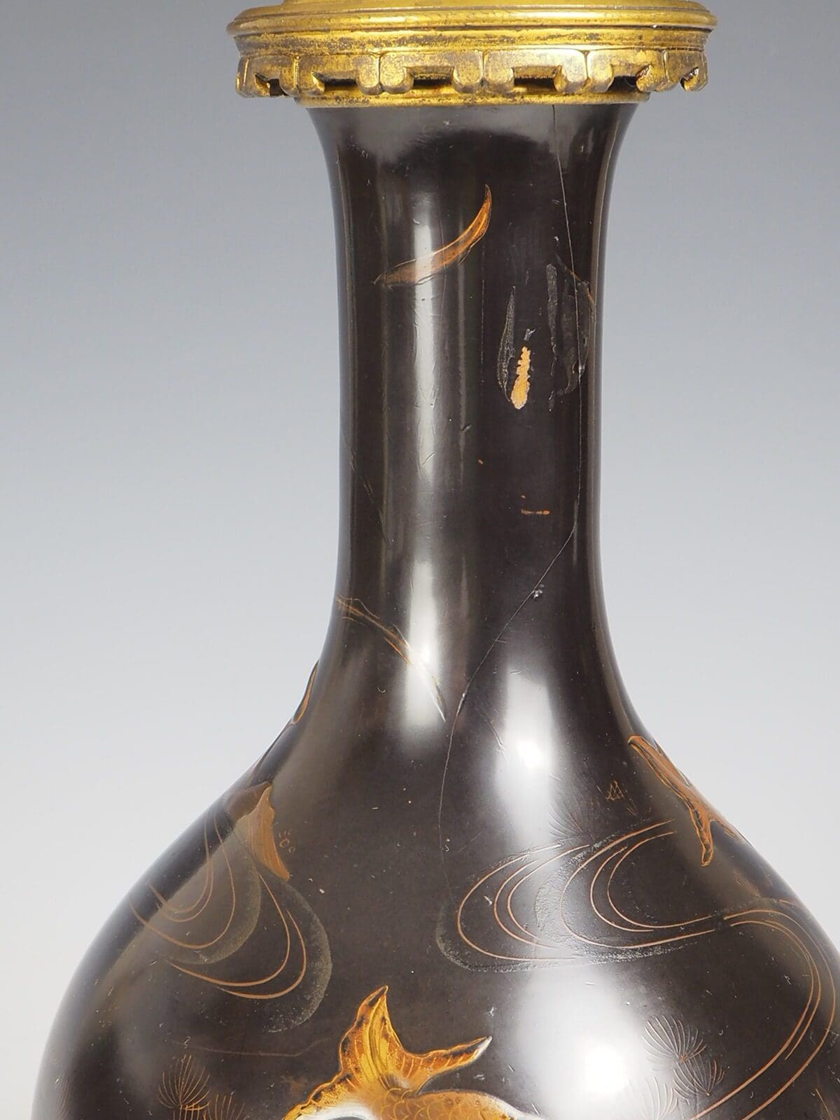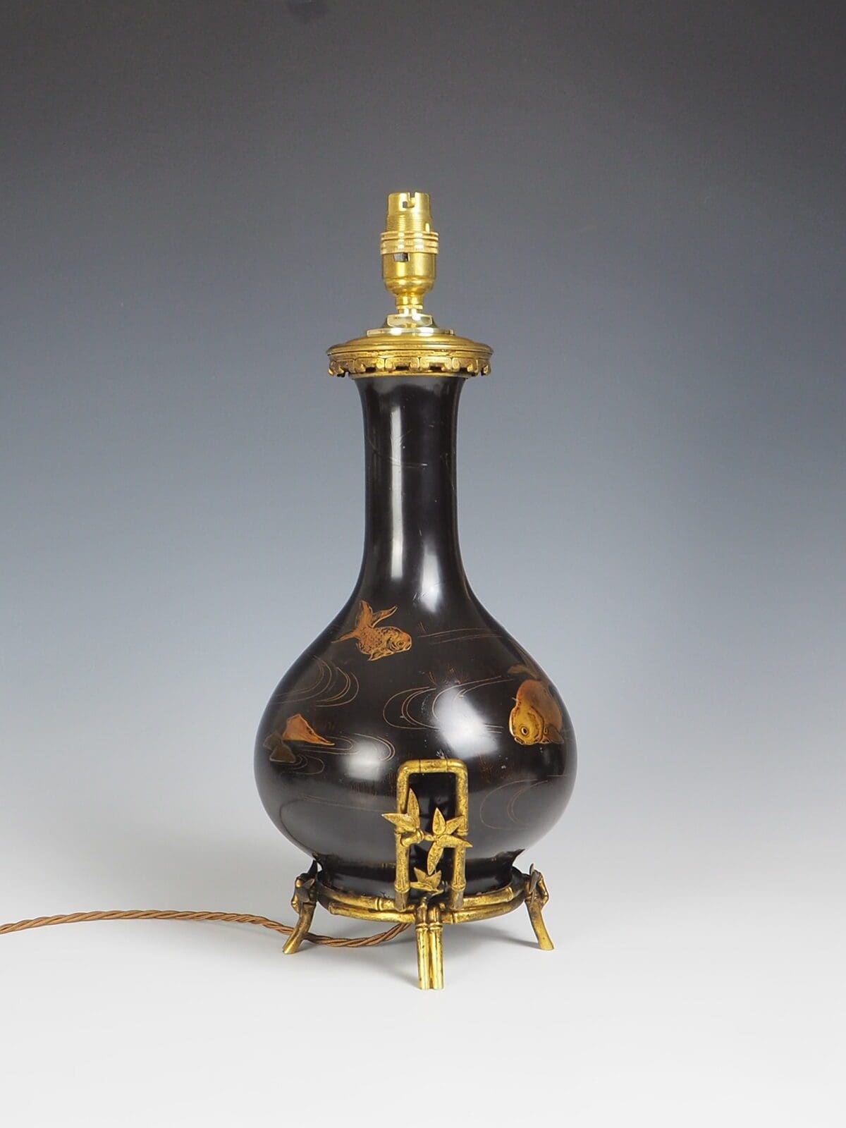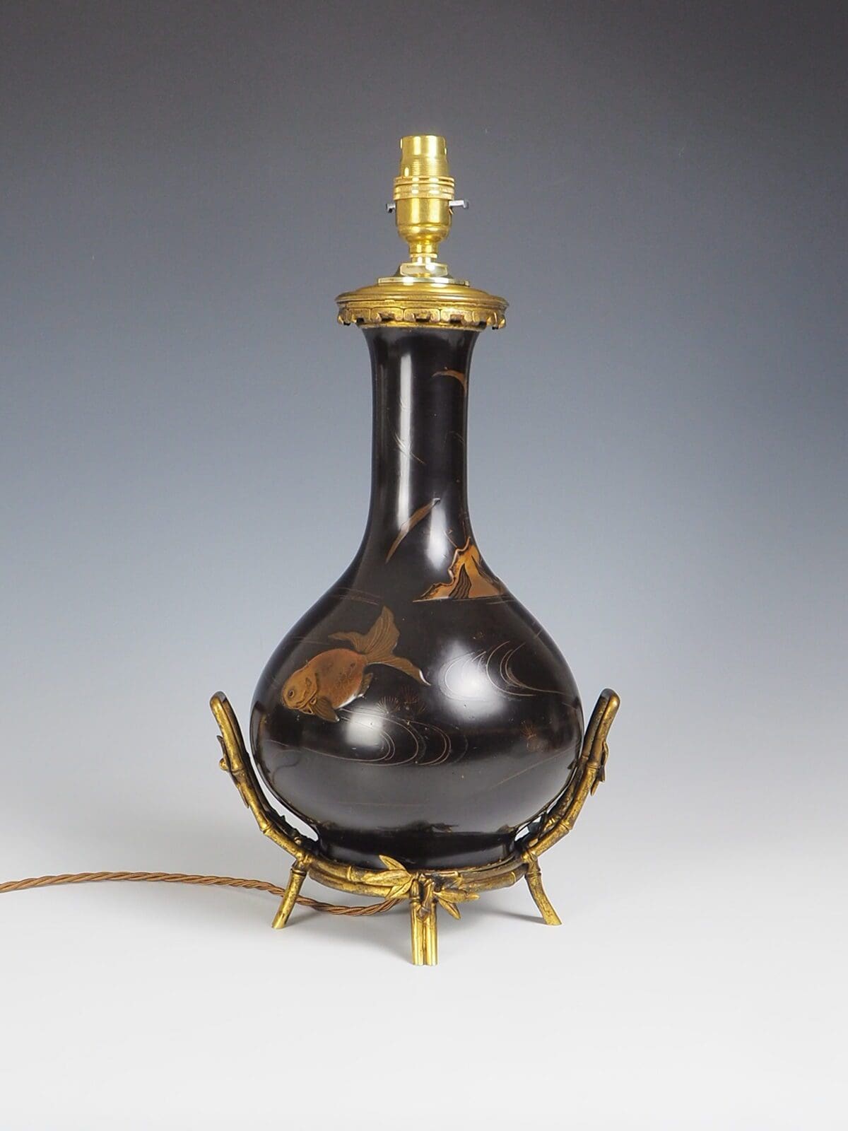 Antique Japanese Laquered Porcelain Table Lamp, a true masterpiece that encapsulates the beauty and craftsmanship of Japanese art. This exquisite lamp features a stunning combination of painted patterns depicting fish and mountains, showcasing the intricate detailing and artistic finesse of the era.