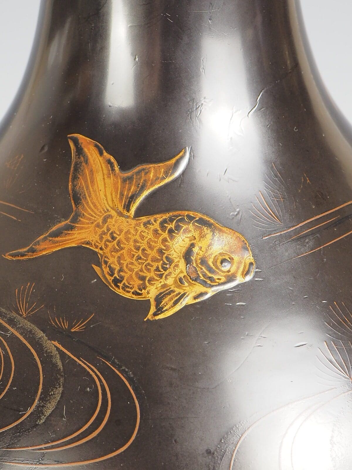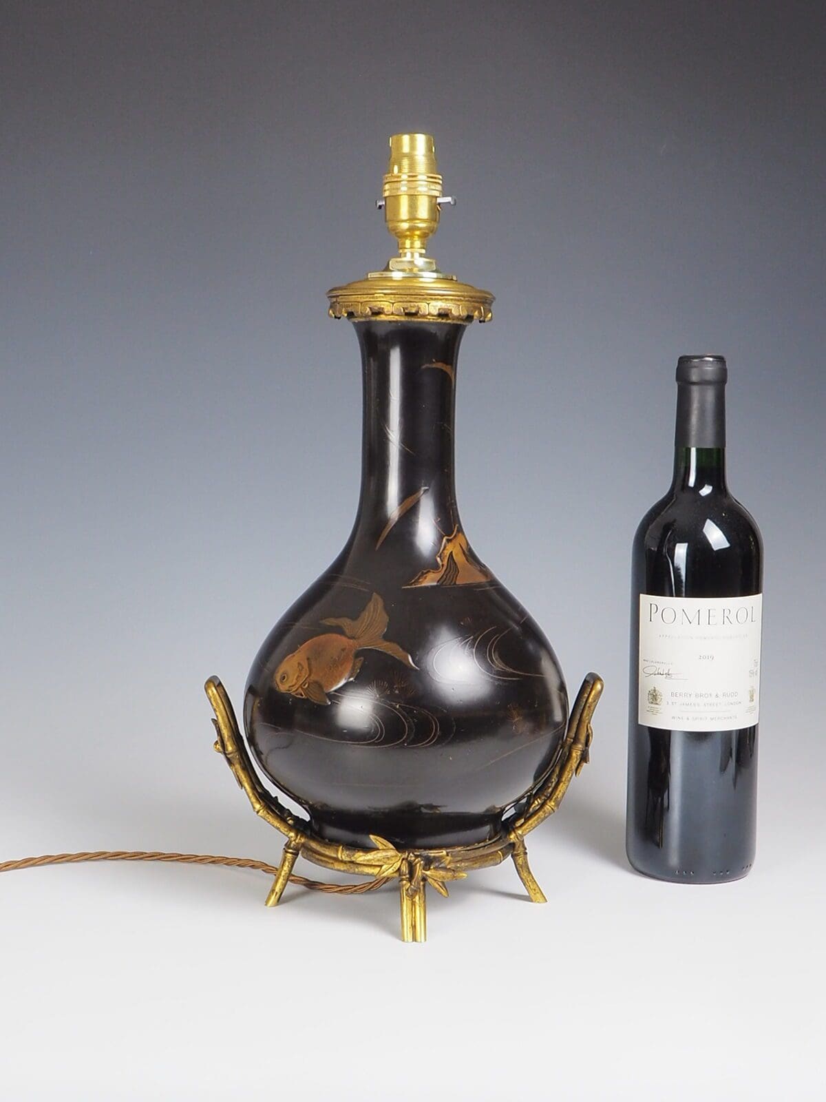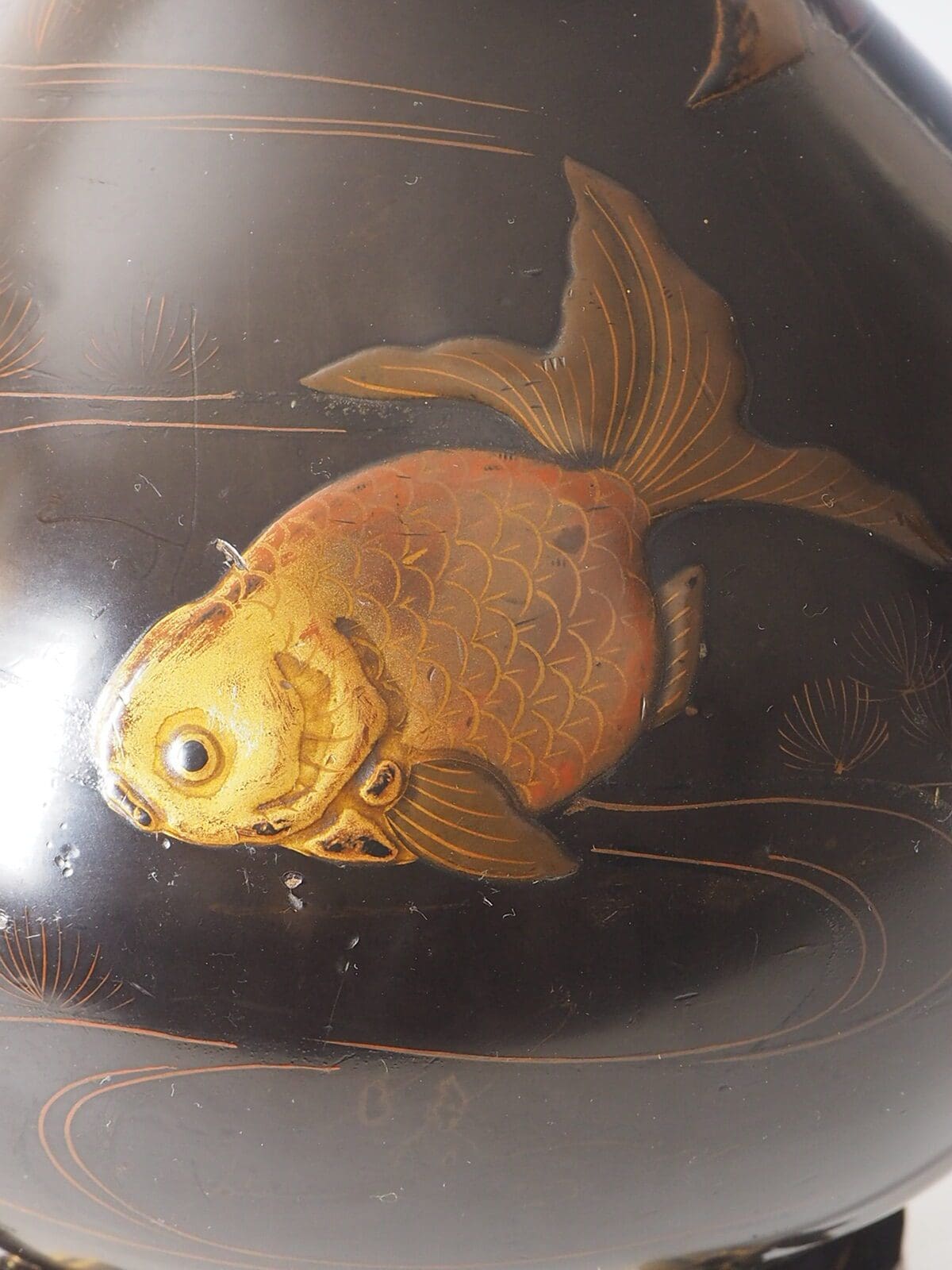 Antique Japanese Laquered Porcelain Table Lamp, a true masterpiece that encapsulates the beauty and craftsmanship of Japanese art. This exquisite lamp features a stunning combination of painted patterns depicting fish and mountains, showcasing the intricate detailing and artistic finesse of the era.