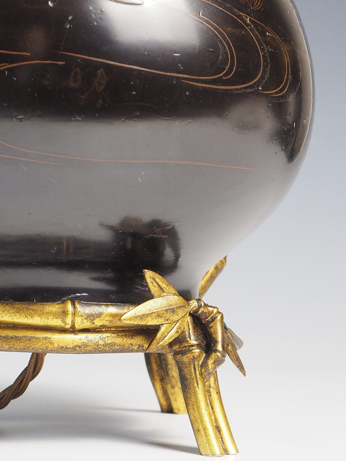 Crafted with meticulous attention to detail, the bamboo base is expertly gilded, adding a touch of opulence. The intricate decorative leaves further enhance its beauty, creating a captivating visual appeal.