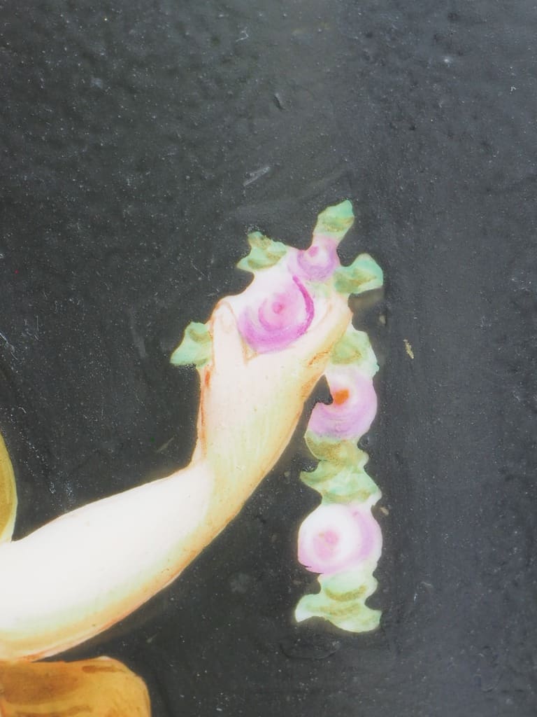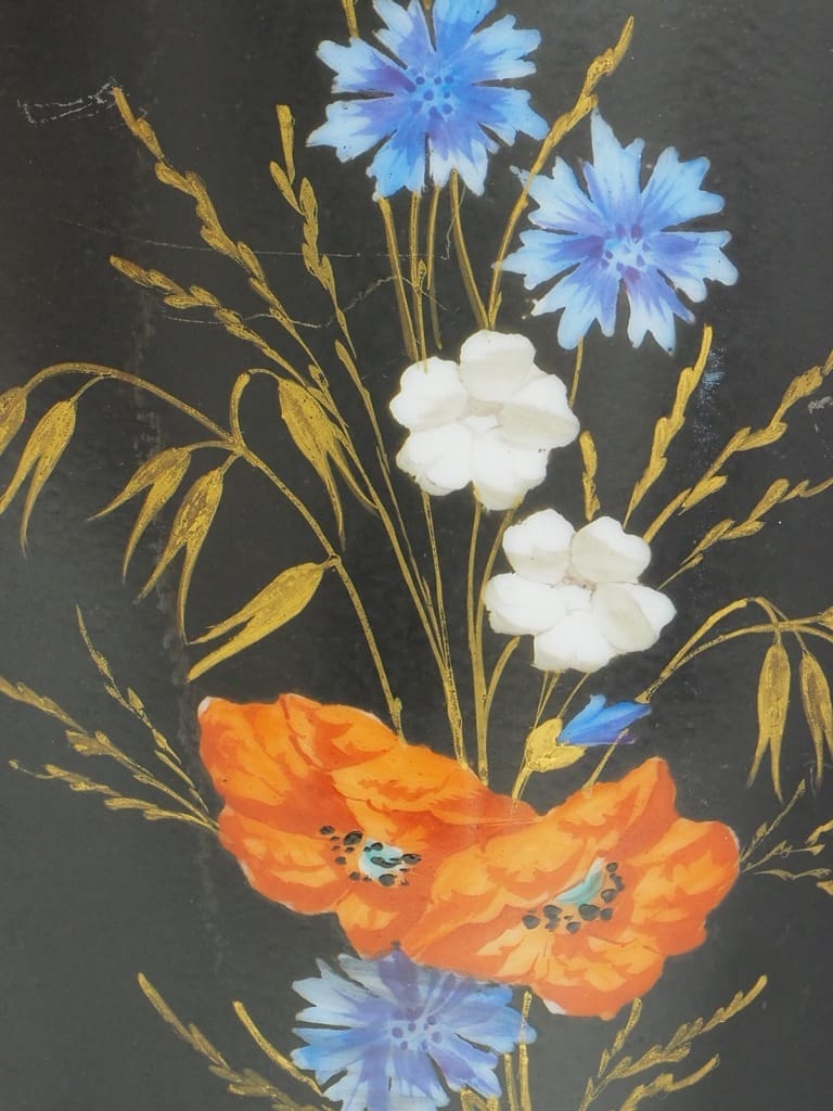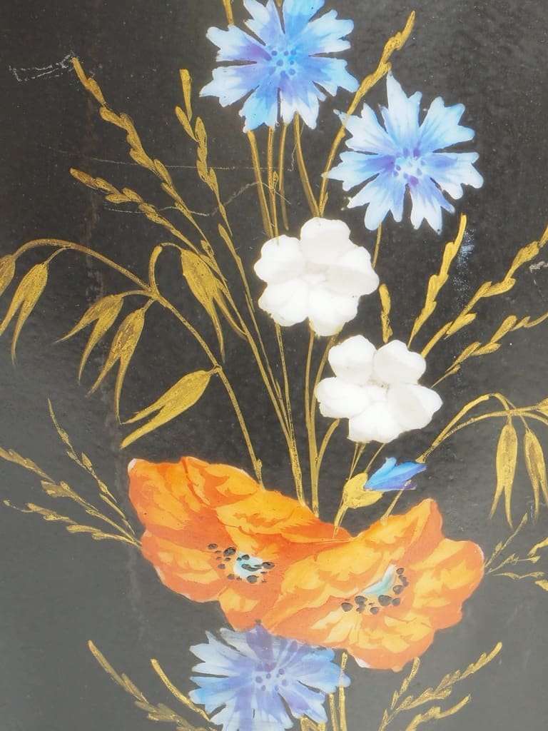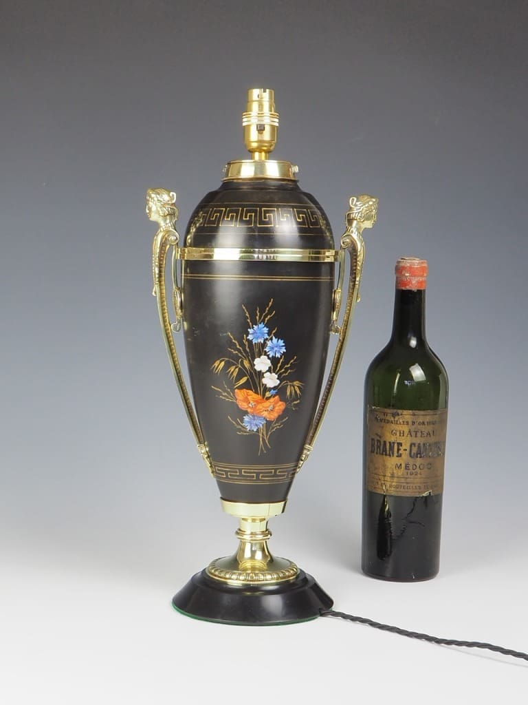 This exquisite table lamp features a stunning black lacquer design adorned with a hand-painted lady on one side and delicate flowers on the other.