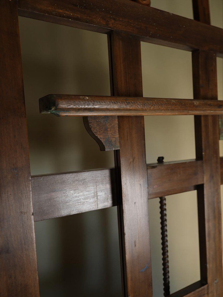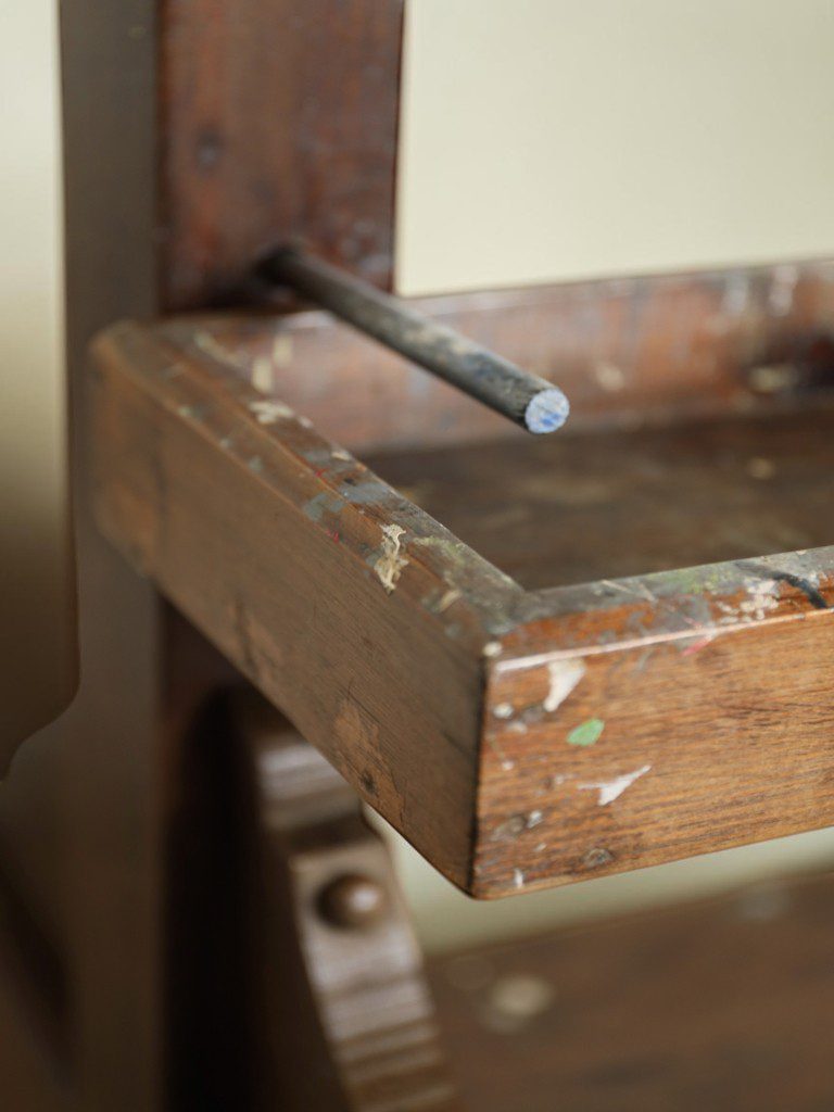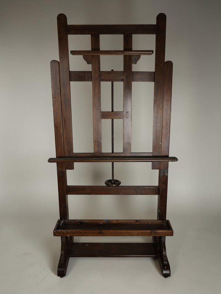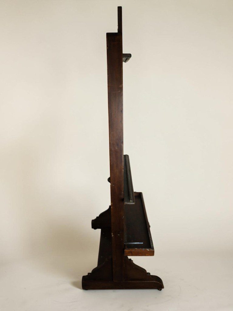 This easel is more than a functional tool; it is a piece of art history. The mahogany has mellowed into a rich, dark tone, showing "studio chatter"—authentic traces of historical paint splatters and marks that document its decades of professional use.