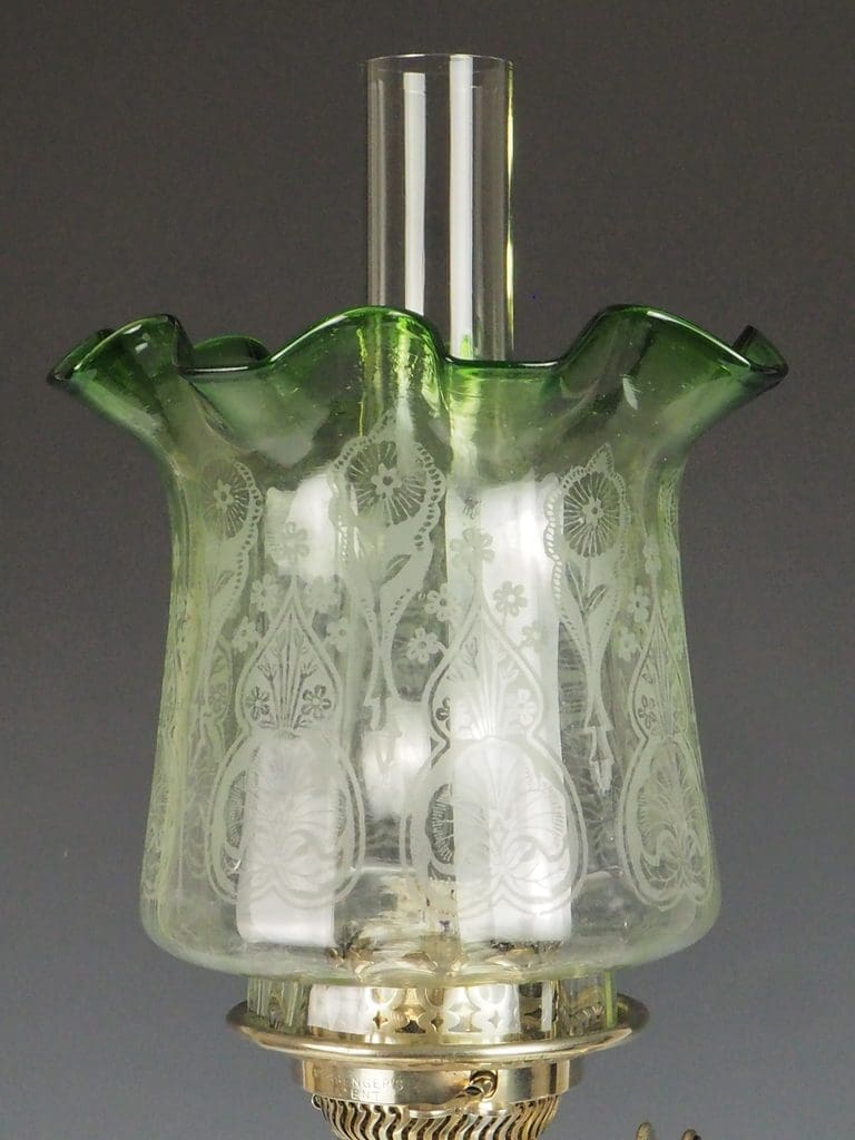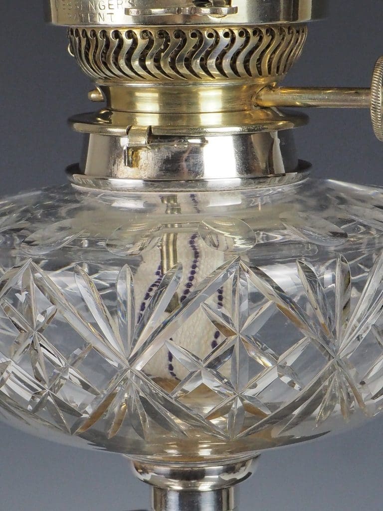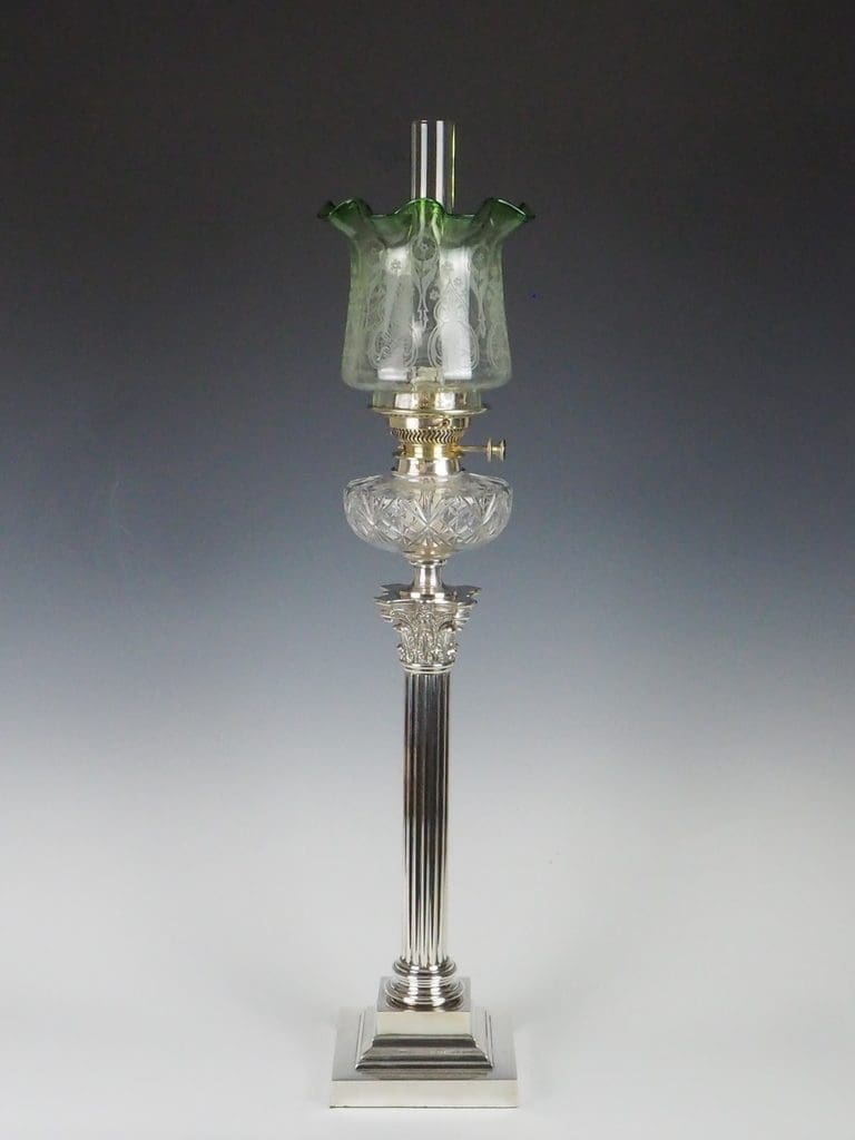 This exceptional Victorian silver-plated oil lamp effortlessly combines timeless elegance with superb craftsmanship. Showcasing a striking fluted Corinthian column, it rests with poise on a four-stepped base, bearing the maker's mark "G.S." The hobnail cut glass font exemplifies the intricate attention to detail that defines the period. A double burner, engraved with "Messengers Patent," is complemented by a finely pierced gallery, which supports the chimney and its original acid-etched shade.
