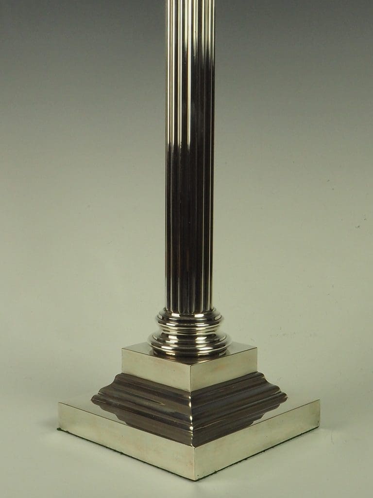 The silver-plated fluted Corinthian column and four-stepped base are in excellent condition, showcasing minimal signs of wear consistent with age.