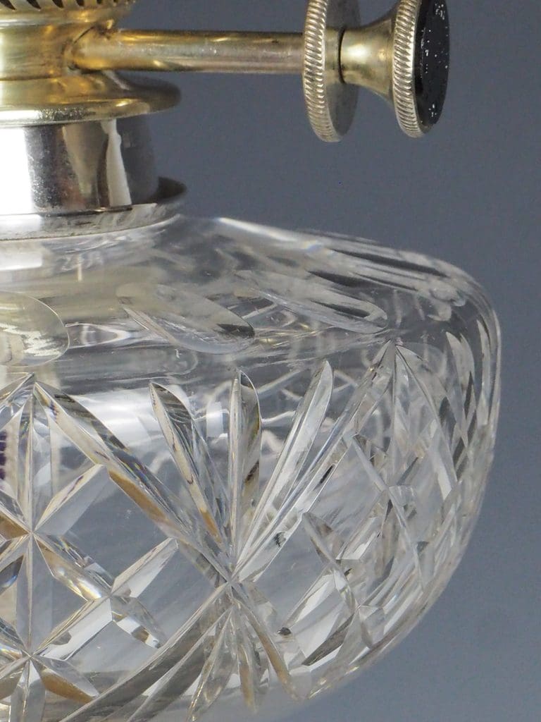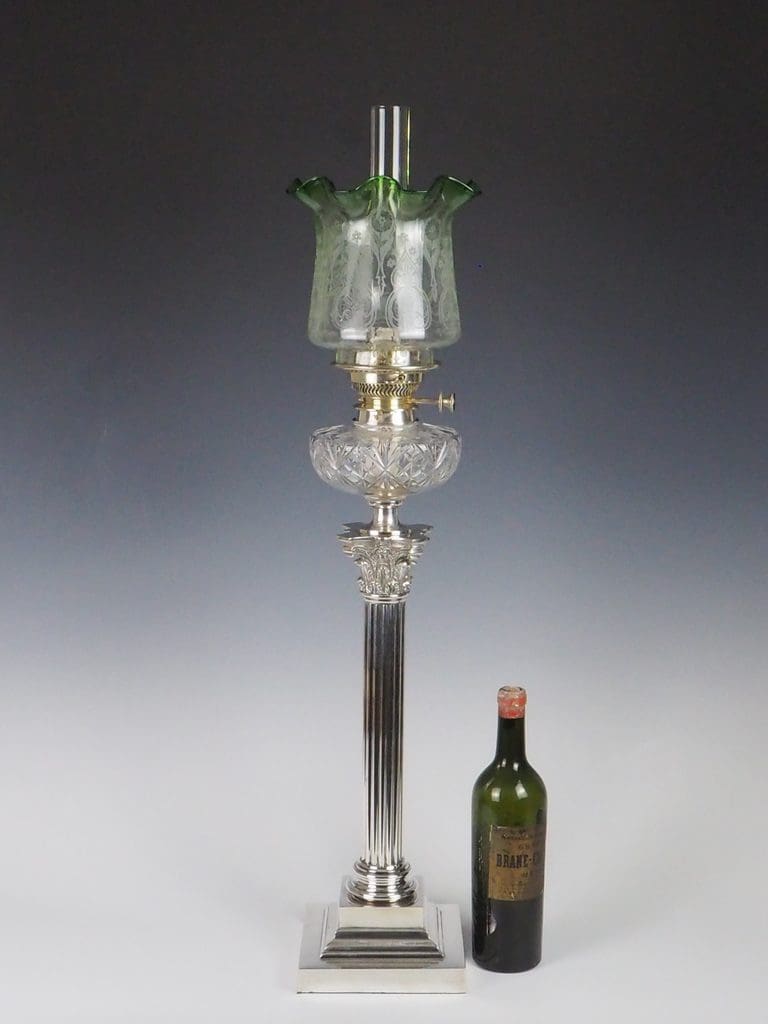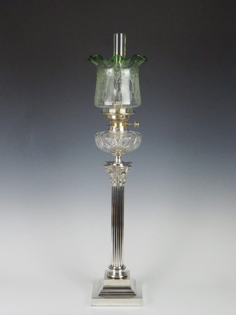 This exceptional Victorian silver-plated oil lamp effortlessly combines timeless elegance with superb craftsmanship. Showcasing a striking fluted Corinthian column, it rests with poise on a four-stepped base, bearing the maker's mark "G.S." The hobnail cut glass font exemplifies the intricate attention to detail that defines the period. A double burner, engraved with "Messengers Patent," is complemented by a finely pierced gallery, which supports the chimney and its original acid-etched shade.