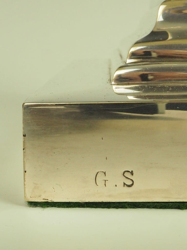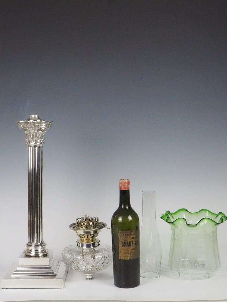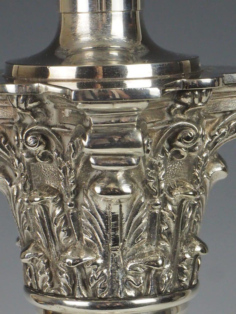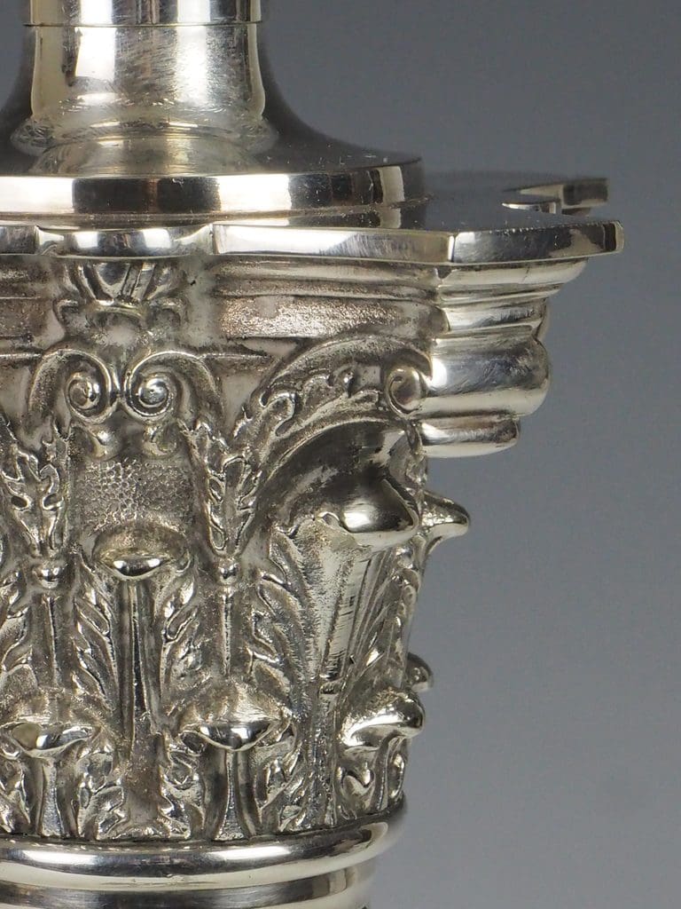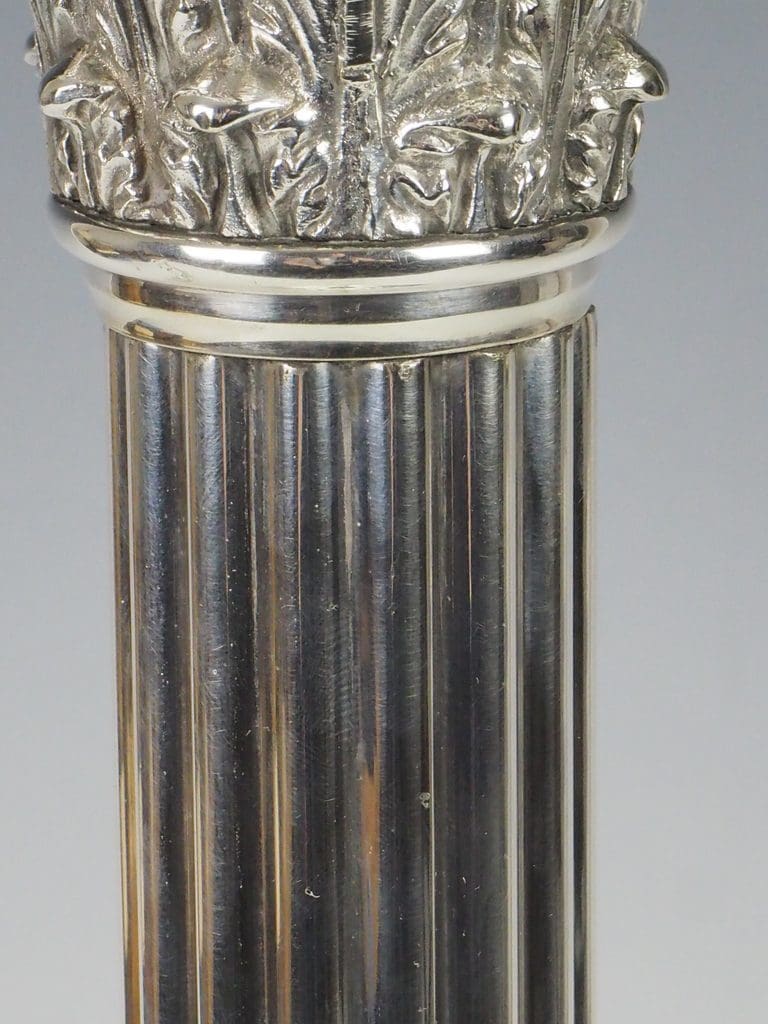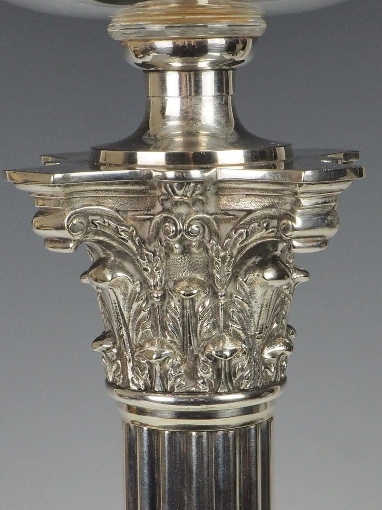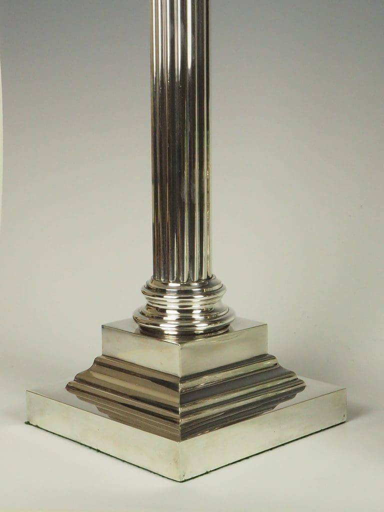 The silver-plated fluted Corinthian column and four-stepped base are in excellent condition, showcasing minimal signs of wear consistent with age.