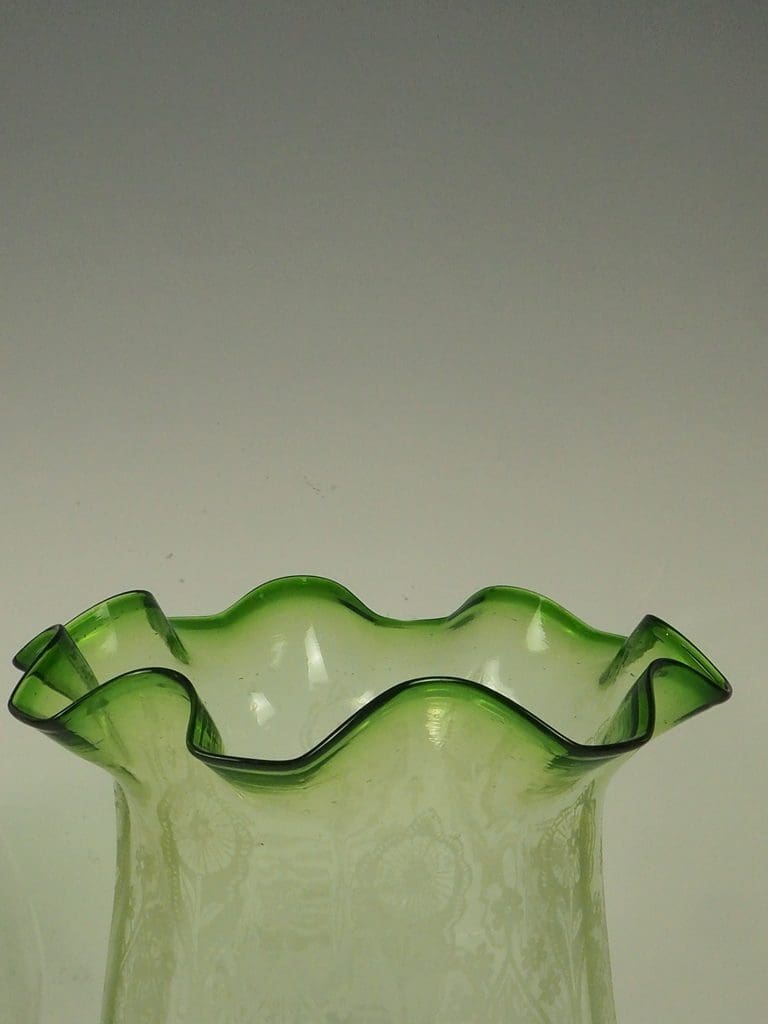 The acid-etched green glass shade is an exceptionally rare and captivating feature. Acid etching, a favored technique of the era, added intricate patterns to glass, elevating the visual appeal of lighting pieces. The vibrant green hue, adorned with delicate etching and natural air bubbles formed during its creation, highlights the shade’s authenticity and charm. This antique shade remains in excellent condition, free from cracks or repairs.