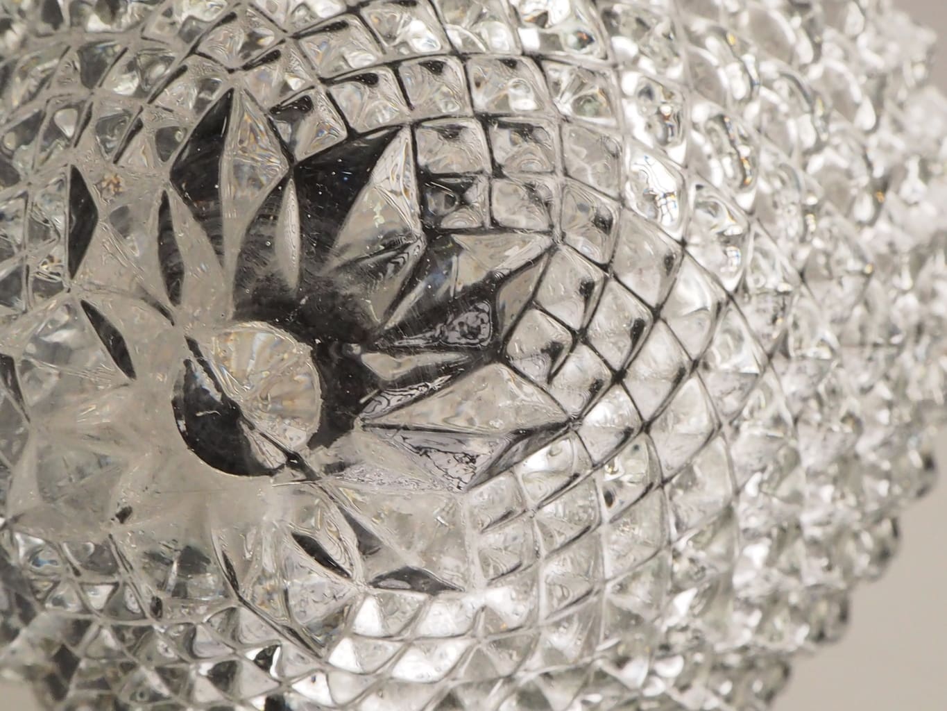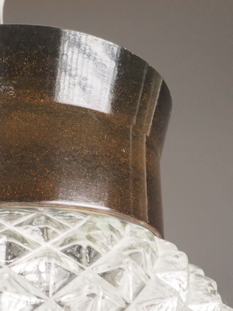 This vintage Bakelite pineapple glass ceiling light is in very good vintage condition, with only light signs of age appropriate to its mid-century origin. The pressed glass globe is intact, free from cracks or chips, and retains its crisp cut-glass style detailing. The Bakelite mount is in excellent condition with no warping or significant wear.