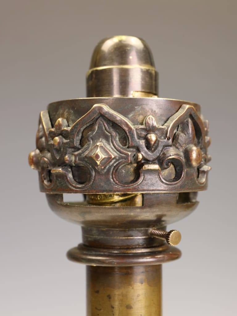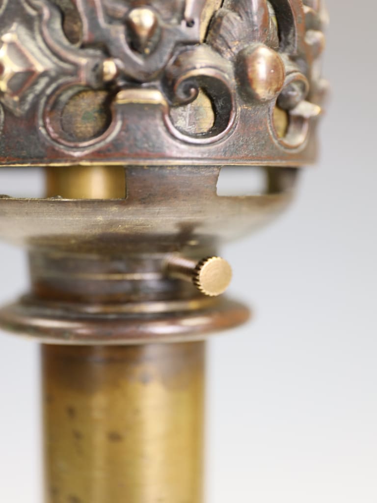 The base is a triumph of Regency-into-William IV design, heavily embellished with scrolled foliate motifs, shell-like forms, and raised circular bosses. The capital is equally ornate, featuring a pierced gallery with gothic-inspired tracery that served a functional purpose in the patent's airflow design. The brass retains a deep, honest patina with a rich bronze-like tone, showcasing the high copper content typical of premium 19th-century English brassware.