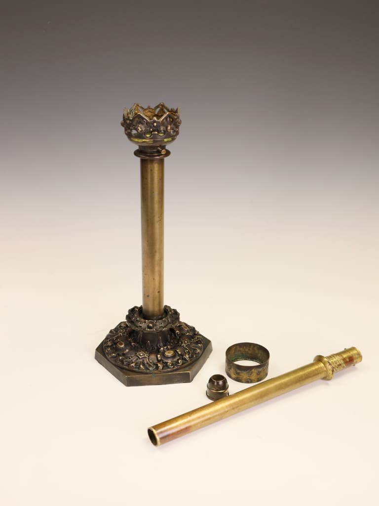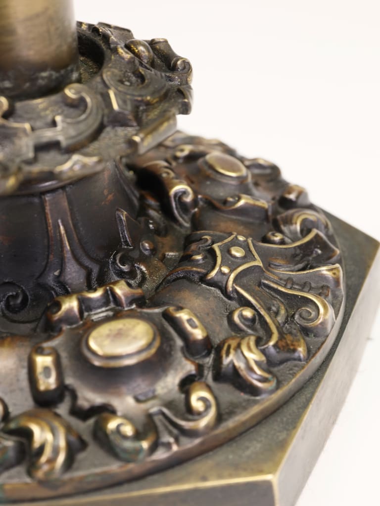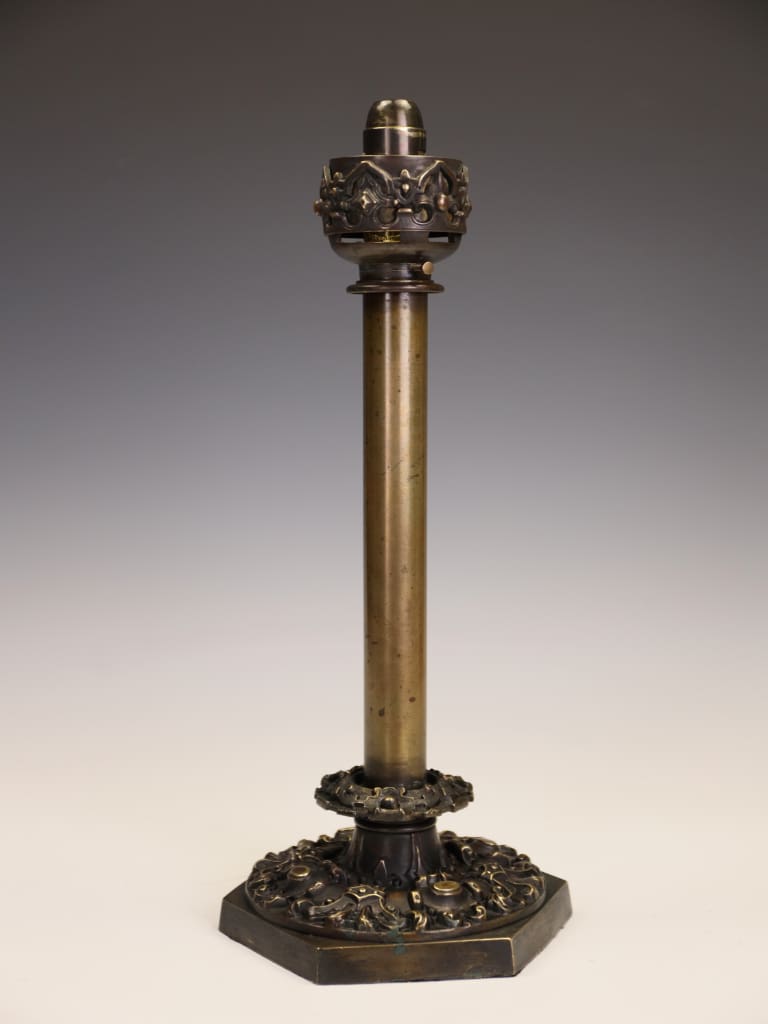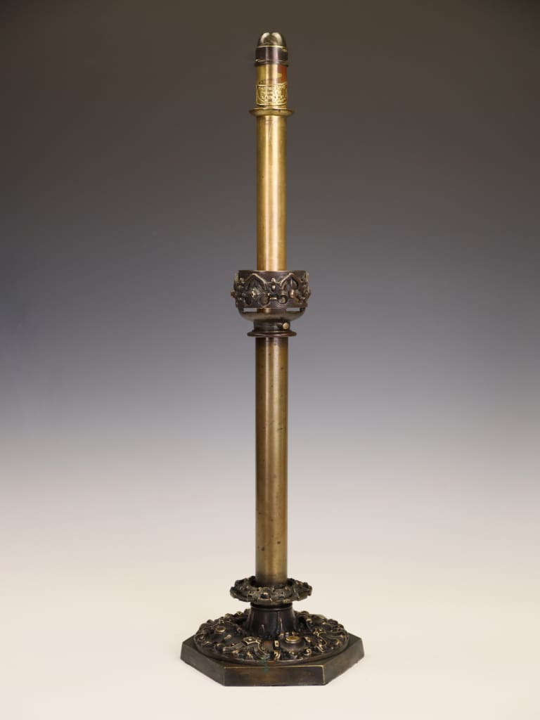 Founded in the early 19th century, Palmer & Co were the pioneers of the "Magnum" and "Candle Lamp" patents. Their innovative spring-loaded mechanisms allowed candles to be pushed upward as they burned, maintaining a constant flame height—a revolutionary concept before widespread gas lighting. This specific model, bearing the prestigious "Palmer & Co London" stamp on the nozzle, dates to the William IV period (c. 1830–1837), a transitional era known for its bold, heavy, and increasingly naturalistic ornamentation.