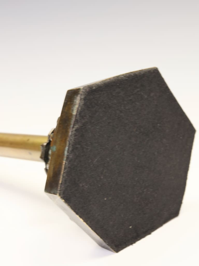 The candlestick is heavy and sits perfectly level on its broad hexagonal base. The telescoping mechanism is intact, though it is sold as a decorative historical object.